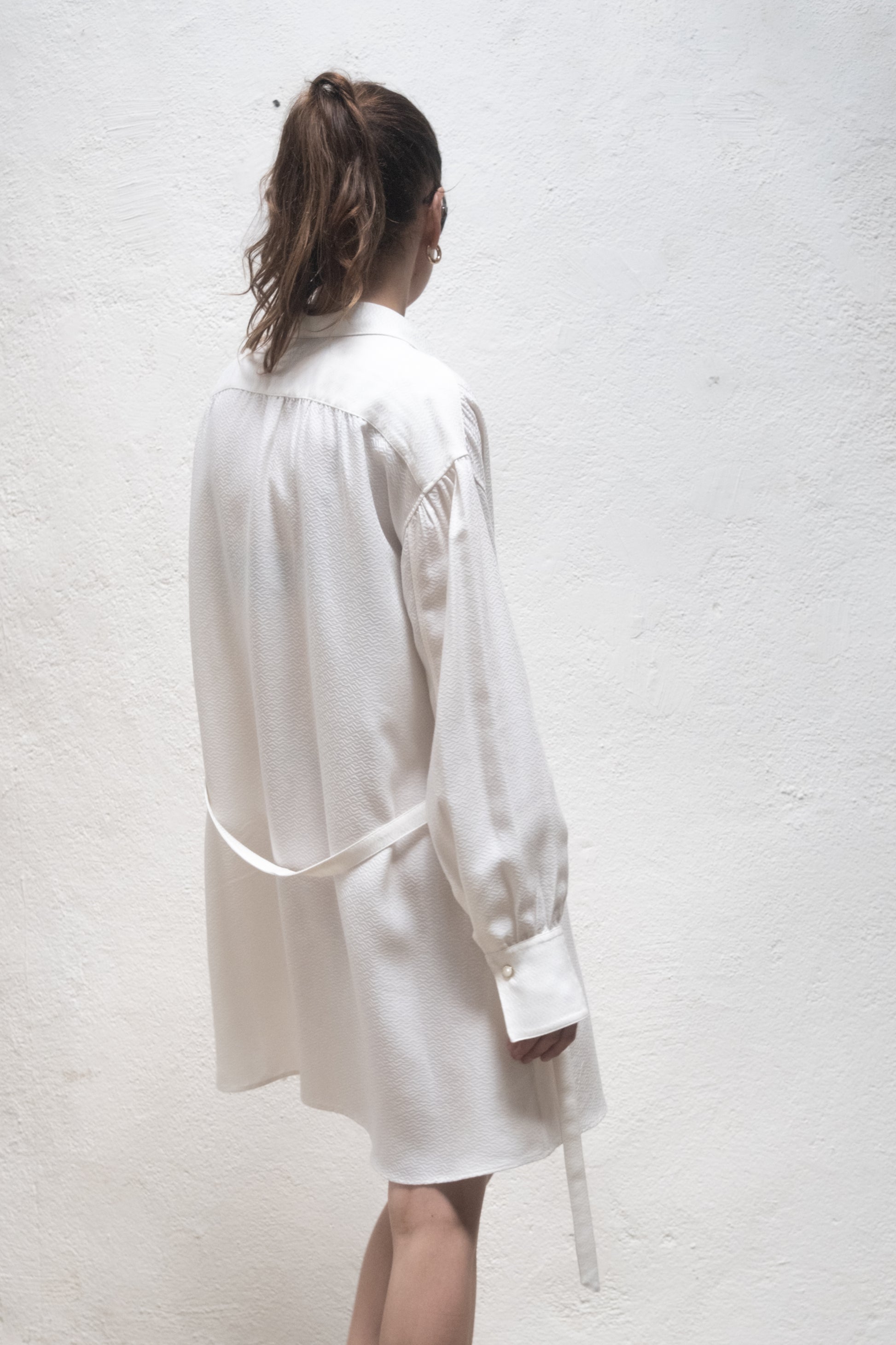 White Jaquard Metric Rayon Shirt Dress with Pleated Cuff