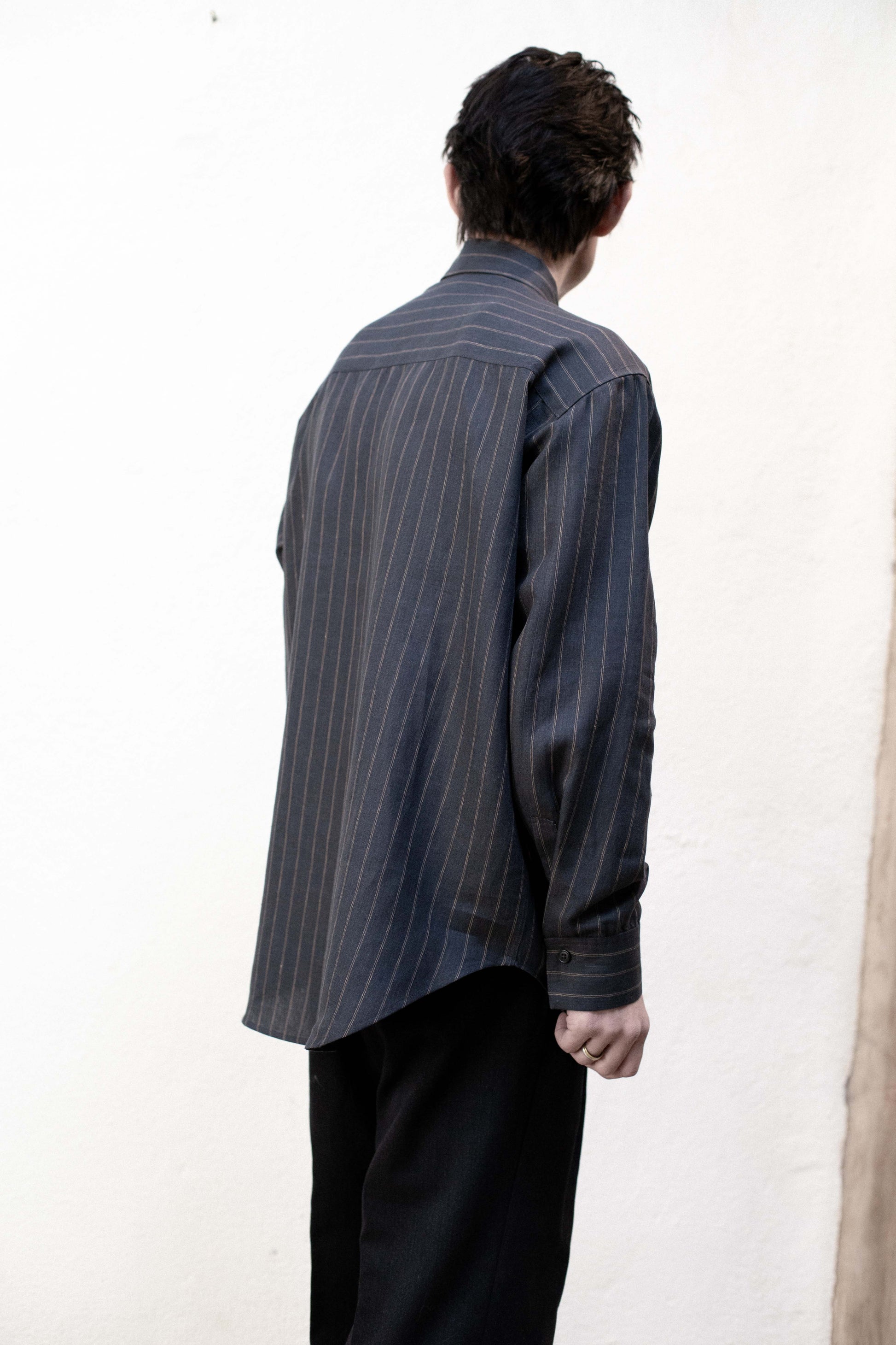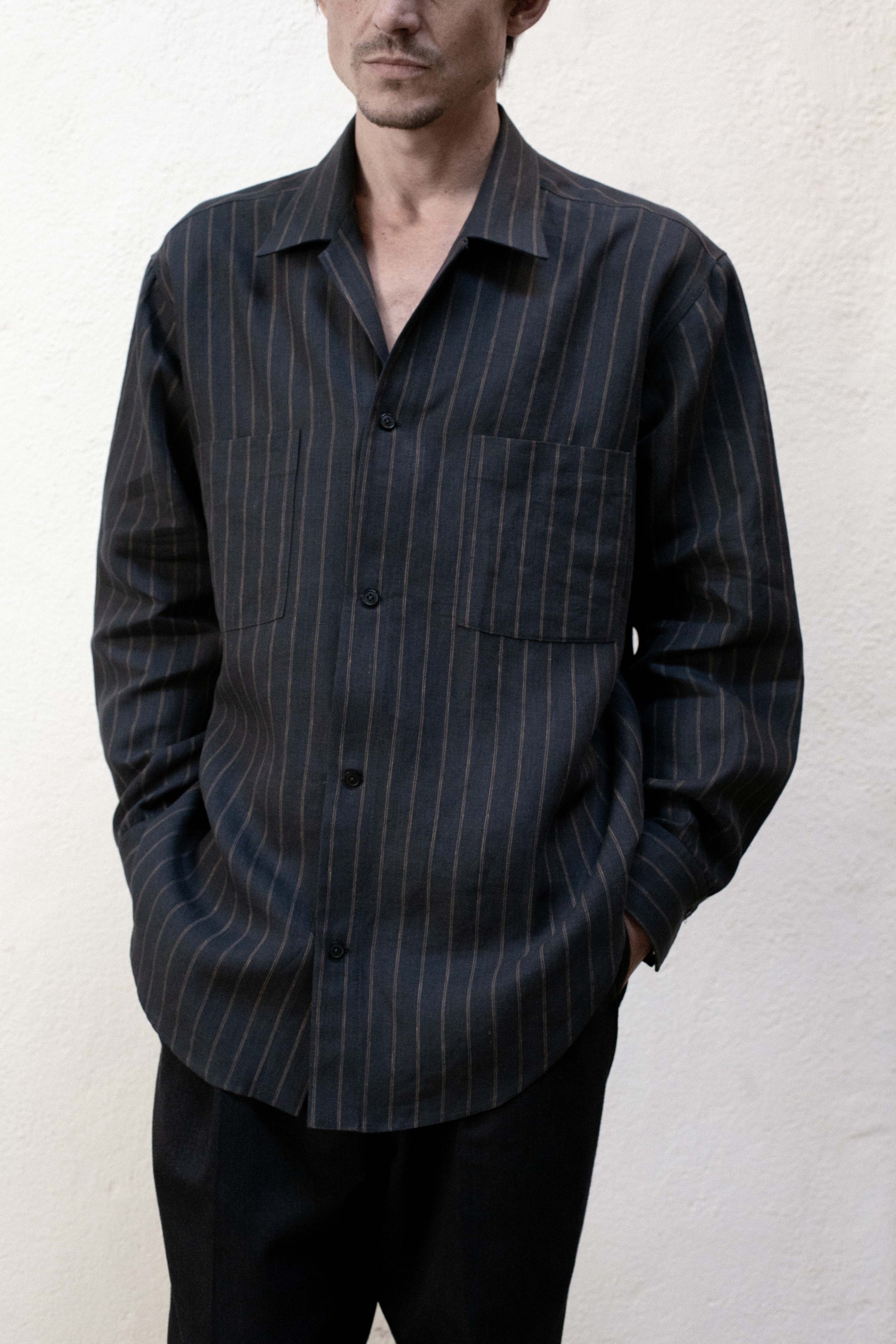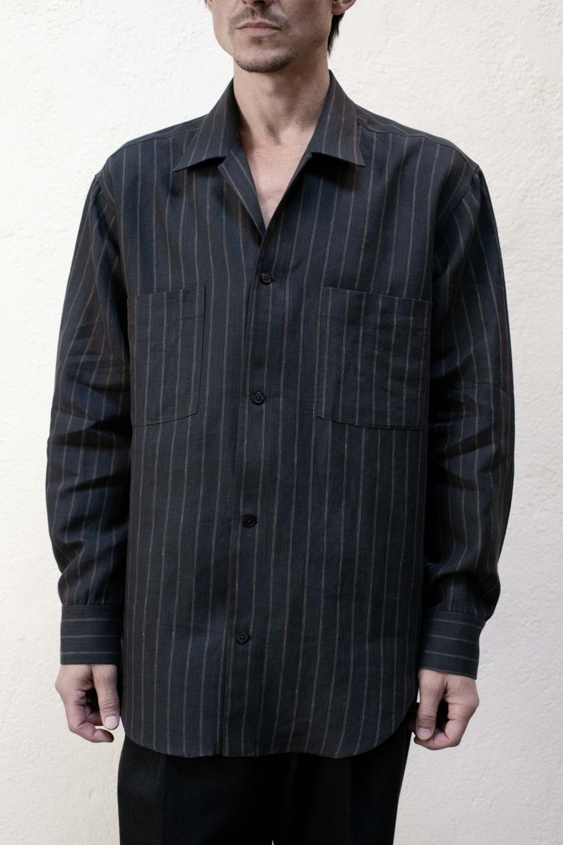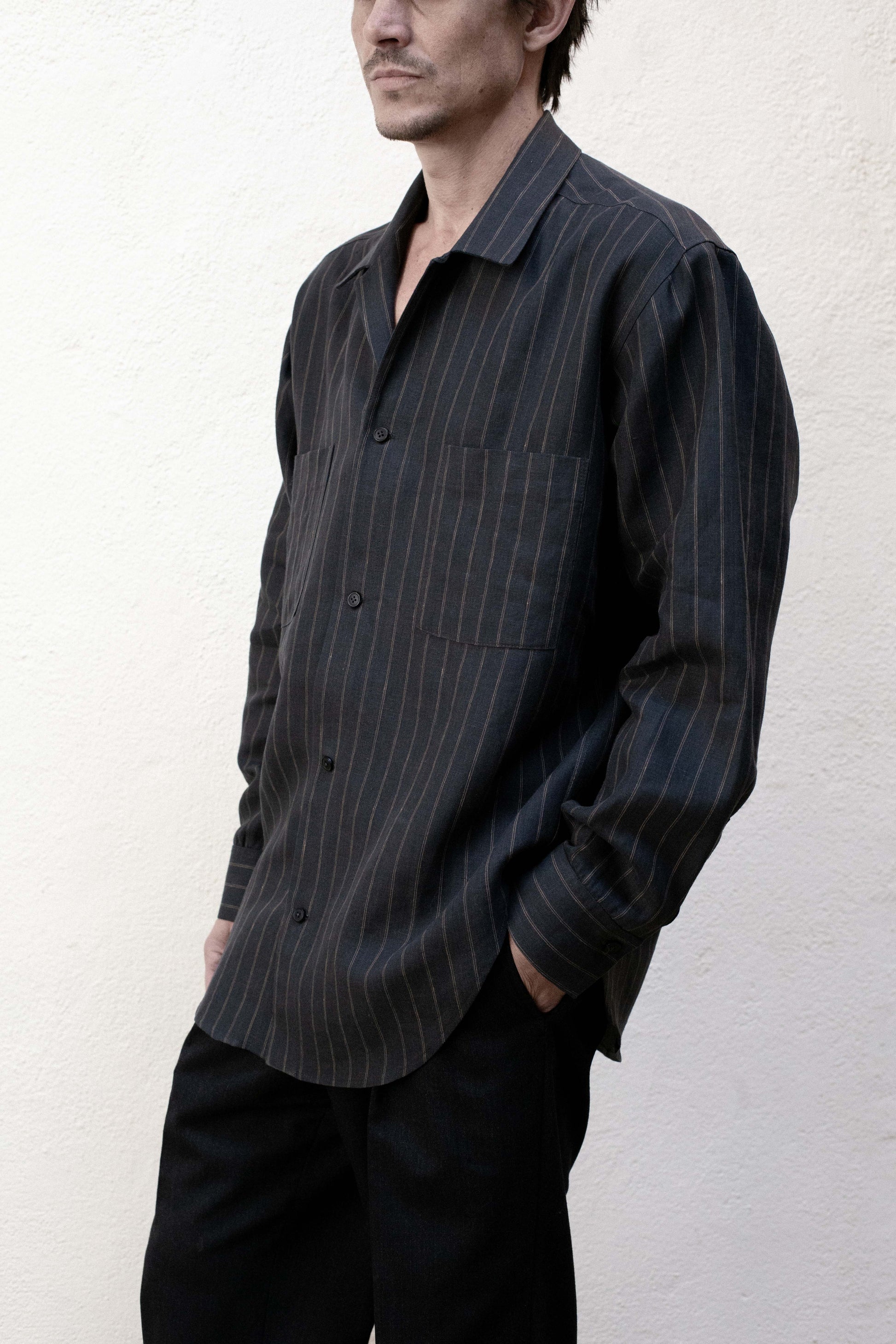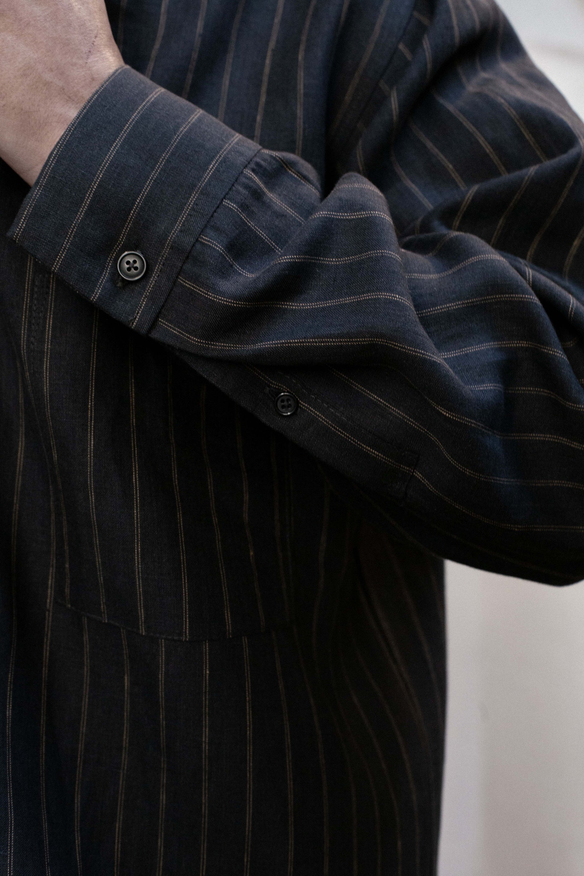 This Casual Shirt in dark stripe linen offers a relaxed fit and a lightweight, smooth texture. Crafted from 100% Italian linen, it features single needle stitching, two deep chest pockets, and a "Cubano" style collar. Long sleeves with deep pleat cuff details add a refined touch to the laid-back design.