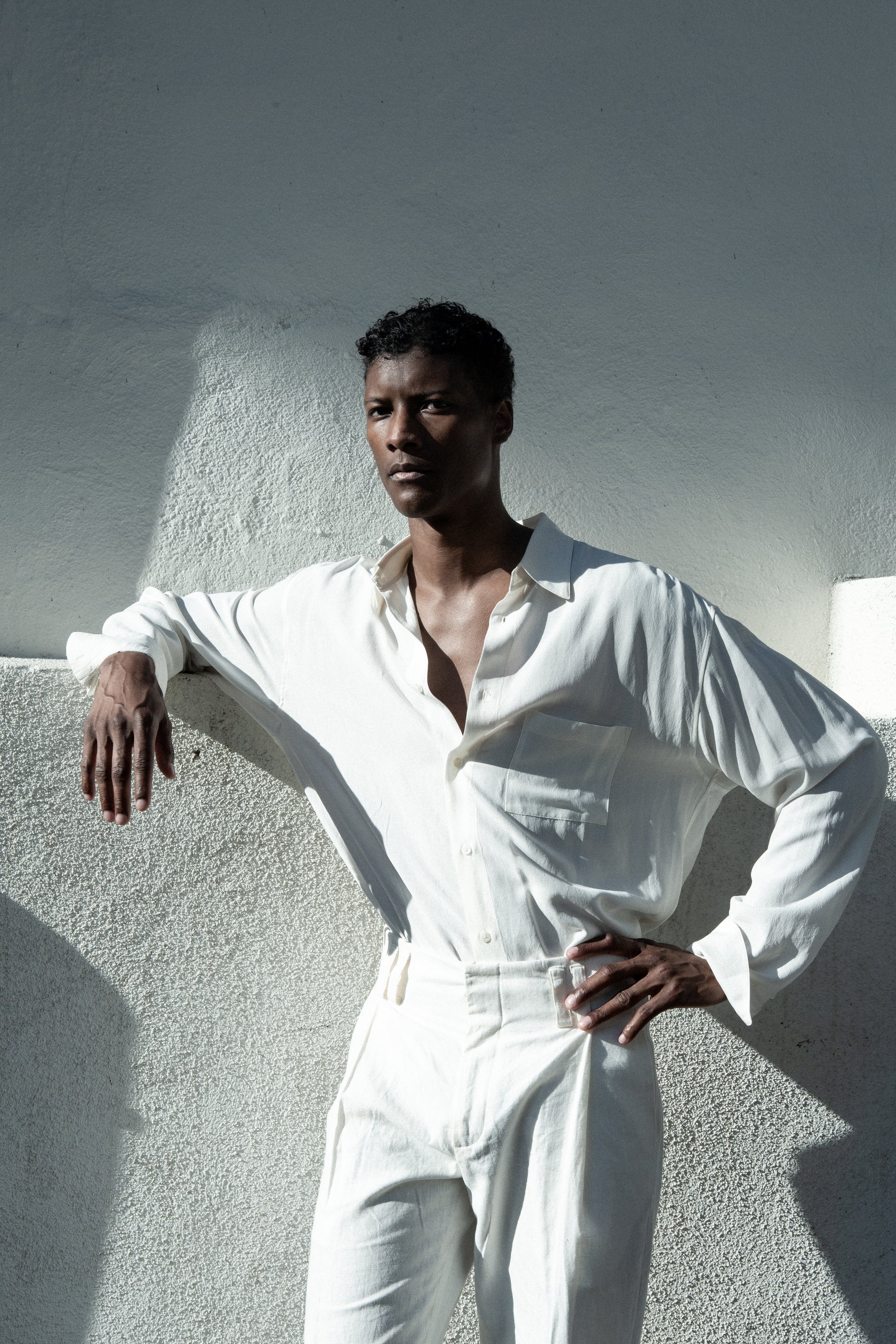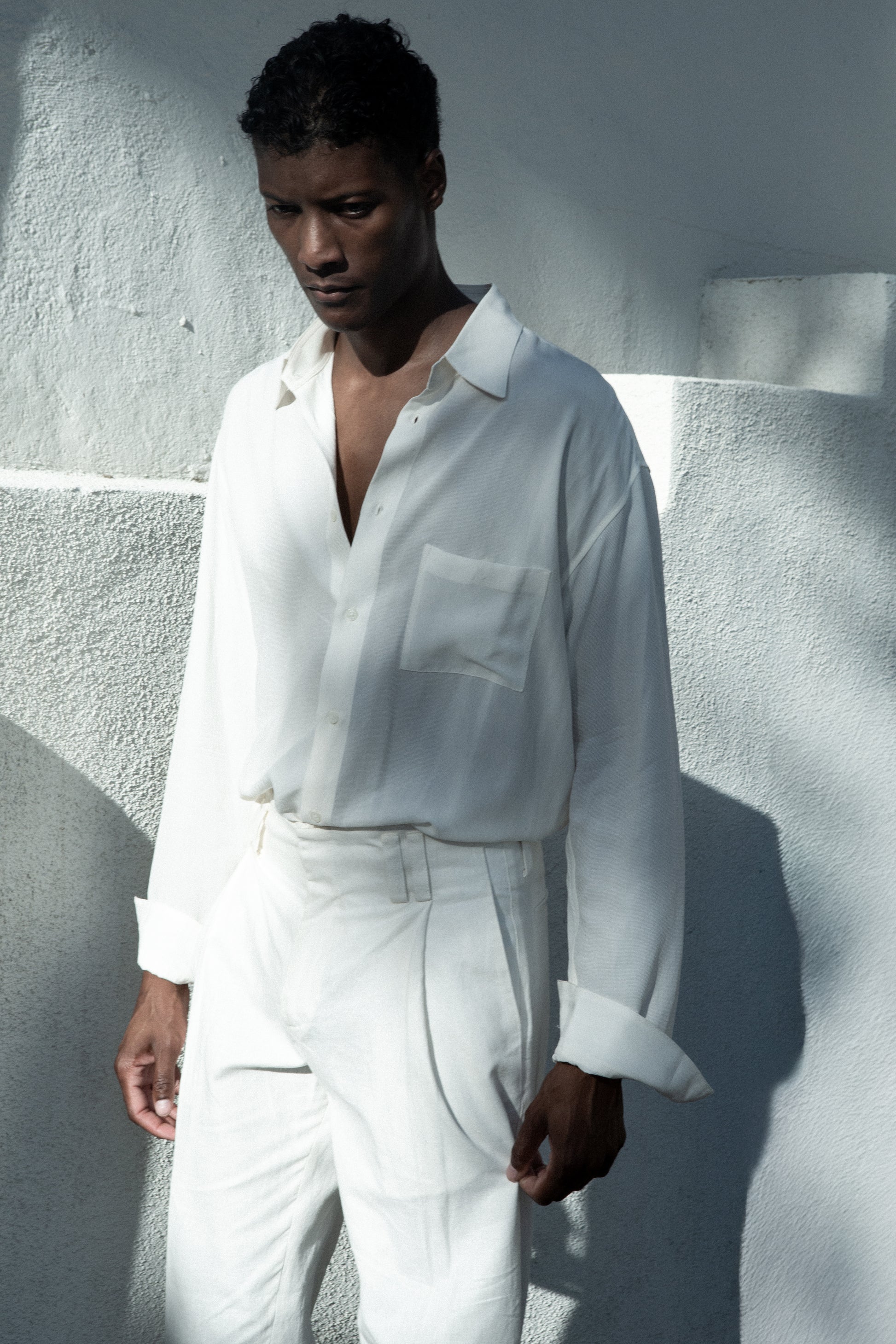 This Dress Shirt in White Tencel features a relaxed fit and combines classic style with modern comfort. Crafted from Silk and Linen Blend Fabric, it offers a soft, luxurious feel. The single needle stitching, chest pockets, and classic collar provide timeless appeal, while the long sleeves with deep pleat cuff details add a refined finish.