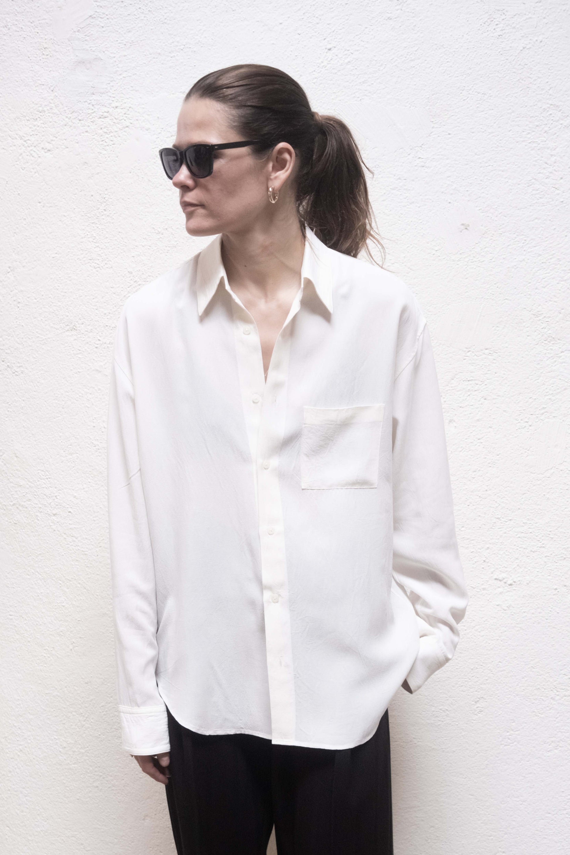 This Dress Shirt in White Tencel features a relaxed fit and combines classic style with modern comfort. Crafted from Silk and Linen Blend Fabric, it offers a soft, luxurious feel. The single needle stitching, chest pockets, and classic collar provide timeless appeal, while the long sleeves with deep pleat cuff details add a refined finish.